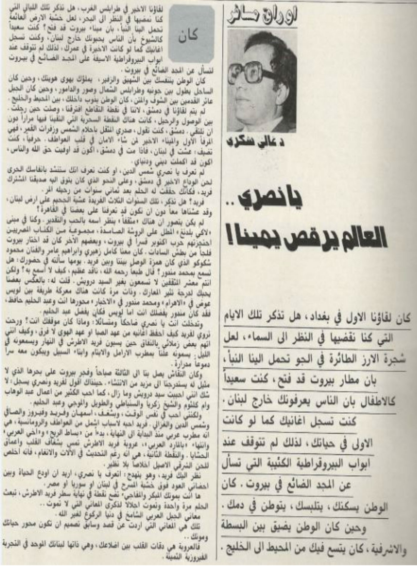 … ويدور الكلام وشِعر الأغنيات في نفوس ناس يشبّهونه بواقعهم، يأخذونه مثالاً… وصوت نصري يلحّ، ويسترجع ما كانه، وكأنه الحاضر المتحسّر معنا على بلد سقطت الحرّية فيه صريعة على أبواب السياسيّين.