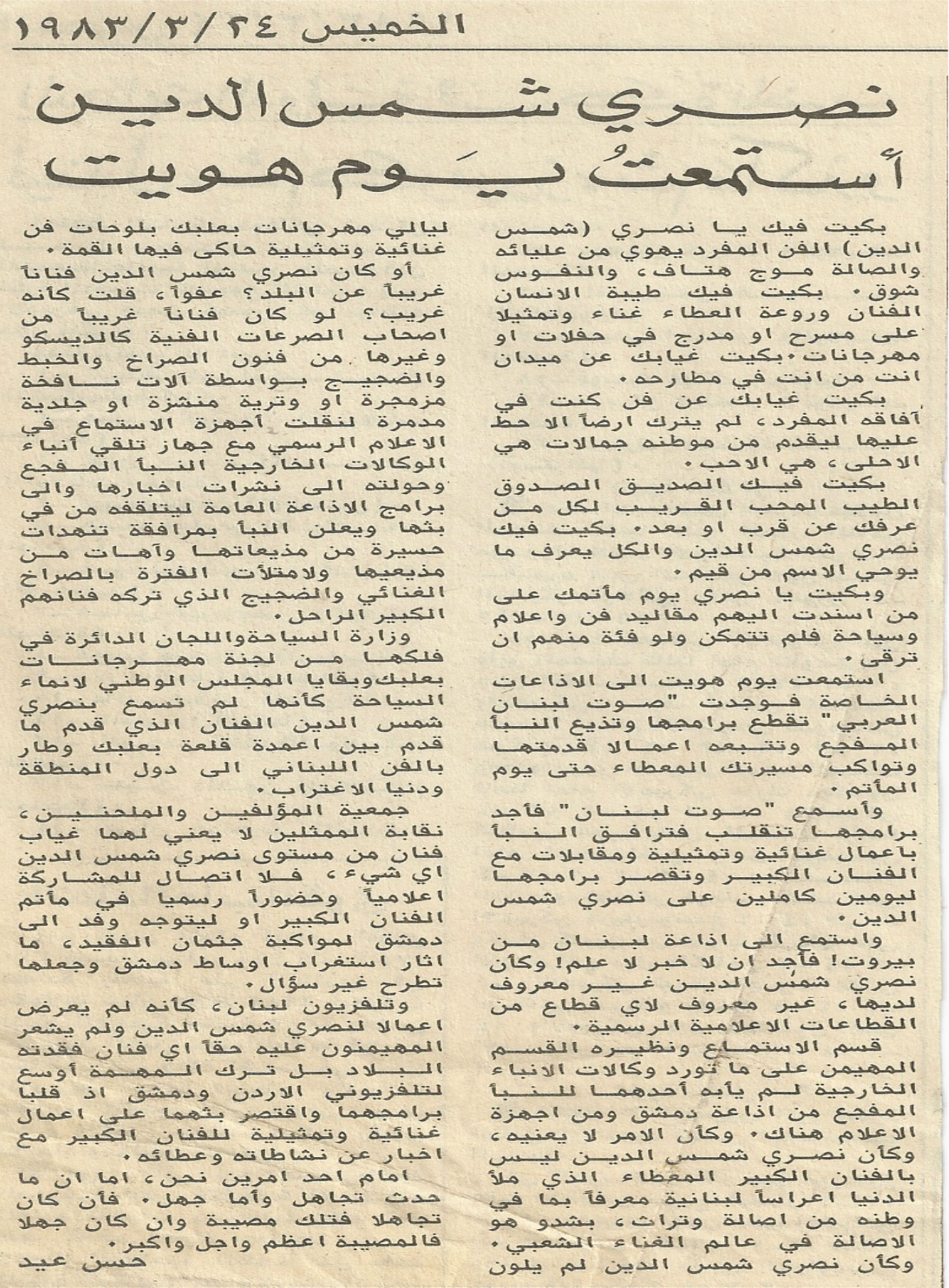 يوم وفاته كنت في مراهقتي ، ولن انسى لحظة كيف مرت تلك الواقعة الأليمة.. فعمو نصري رحل فجأة في عز عطائه ومعظم اهل القرية لم يستطيعوا الوصول اليها لوداعه بسبب ظروف الحرب الاهلية والاحتلال.. لكن ربما كان في ذلك عبرة.. فعدم وداعه أبقى صورته حياً دائماً في قلوبنا، وكأنه جزء من كل شيء جميل.. من جون، من الطفولة، من الصوت العذب الحنون، من الاغاني المتميزة الخاصة التي لم تمت ولم يستطع احد وراثة لونها كما غناه وشهره عمو الرائع الكبير نصري شمس الدين..