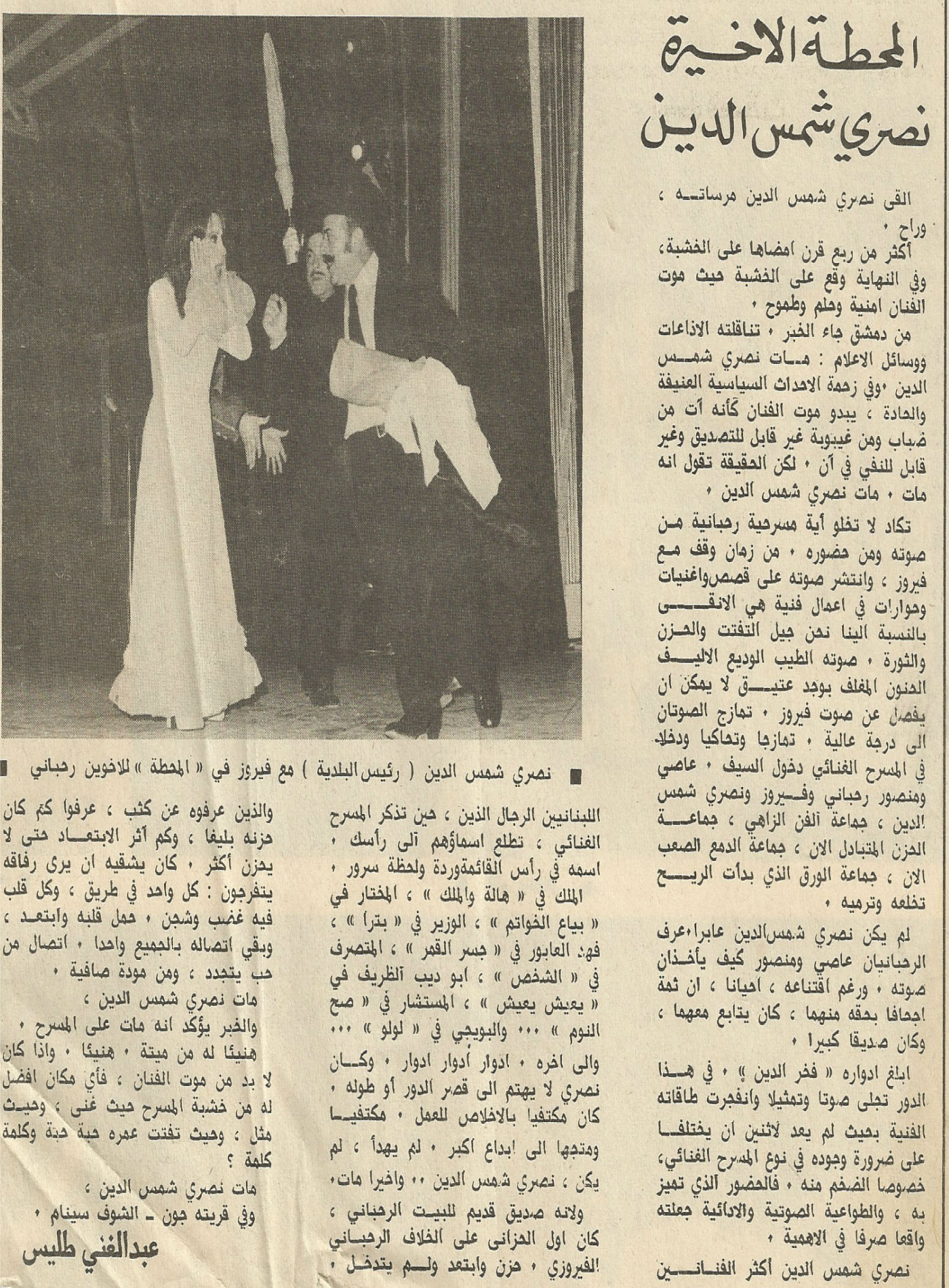نصري، والاسم يختَصر الشهرة، إذ محبّة النّاس تحفظ، كما ذاكرتهم، من رافقوهم في النغم صوتًا يتميّز بخصائص لا تقل تميّزًا عن تجسيده لأدوار على الخشبة، تتجدّد تألقًا حين تُستعاد صورًا من أمس بهي، وأبرزها دور الأمير فخر الدين حين قوله لـ «عطر الليل»: «أنا بسيفي بحرّر هالمناطق، وبحقّق لبنان، وإنتي بالغنيّه بتخلّي إسمو يزهّر وين ما كان».